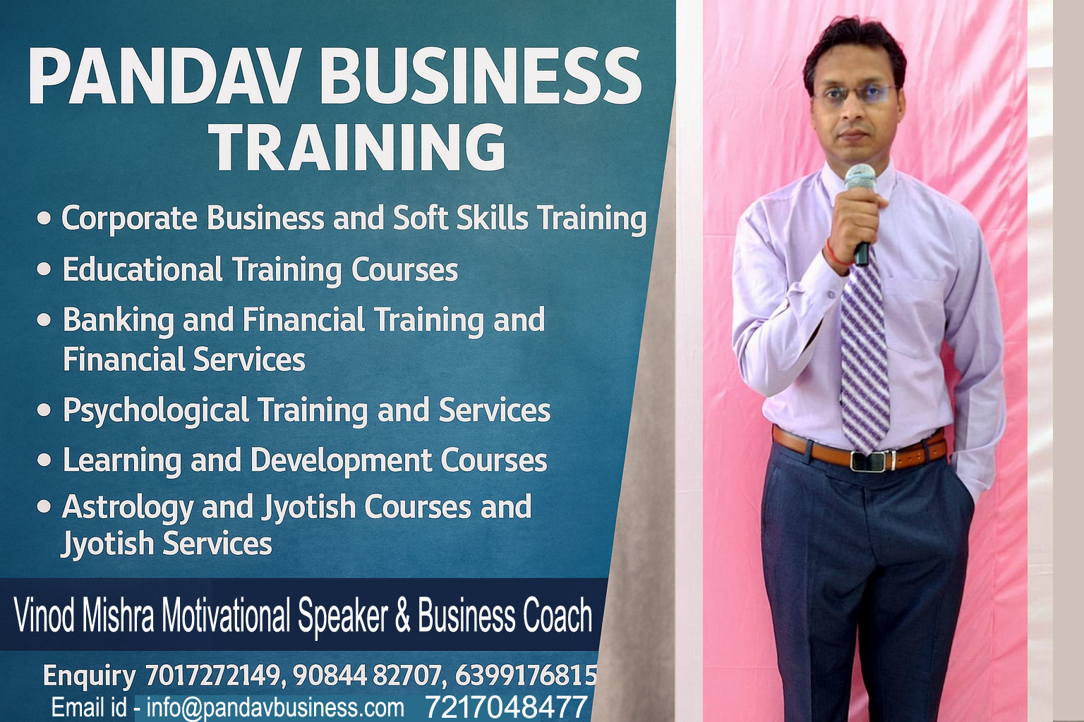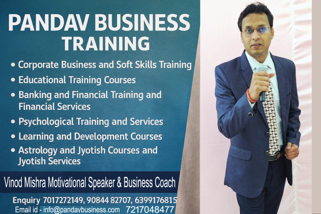 Pandav Business Training, established in 2025, offers high-impact corporate, business, and personality development training. Founded by Mrs. Pooja Mishra and led by Mr. Vinod Kumar Mishra, we focus on creating confident, skilled, and business-ready professionals.